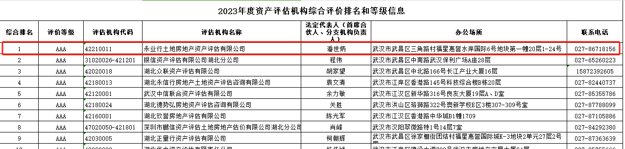 永业行荣登湖北2023资产评估机构榜首